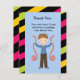 Avsluta din fest på rätt sätt med denna bedårande födelsedags-pojke tack. Den är placerad på en färgrik randig bakgrund. Det finns en ljusblå rektangel med en brunhårig söt pojke i mitten som håller massor av arkadbiljetter. Kolla in våra många andra produkter i denna linje: inbjudningar, porto, klistermärken och många fler.© Jessica Weible Illustrations