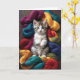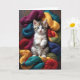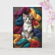 Vacker grå och vit randig katt med blå ögon har gjort sig bekväm bland färgglada trådar av garn på detta tomma vykort.