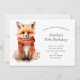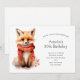 Födelsedagsinbjudan med en illustration av en rödorange rävliv. Ett subtilt leende i ansiktet. Bär en fin röd halsduk för värmen.