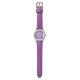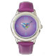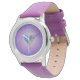 En söt barnklocka med lila bakgrund, ett regnbågshjärta och blå siffror. Klockan har lila läderrem. Perfekt som jul- eller födelsedagspresent till barn. Ett års garanti ingår.
