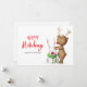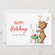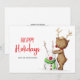 Bedårande julkort med en illustration av en söt ren som bygger en snöman. Illustrerad och designad av Patricia Alvarez.
