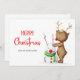Bedårande julkort med en illustration av en söt ren som bygger en snöman. Illustrerad och designad av Patricia Alvarez.