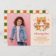 Dessa söta flickors födelsedagstack-kort har en handritad retro-katt som bär solglasögon, tillsammans med blomsterdetaljer (inklusive tusenskönor) och stjärnakcent. Retrotypografi lyder "Tack". En färgpalett med rosa, orange, dämpad guld och olivgröna toner bidrar till den retro-/vintageinspirerade looken! En fotomall och textmallar ingår för enkel anpassning. Baksidan har ett matchande schackbrädemönster. *Illustration och mönster av Tracey Khalei / Orabella Prints.