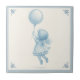 Söt keramisk platta med en blyertsteckning av en liten flicka i en klänning med volanger som flyter under en ballong i stilen av Delftska keramikplattor. Perfekt som dörrskylt för ett nyfödd barnrum eller badrum.