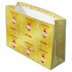 Söt, rolig och även elegant skräddarsydd julklappspåse för barn med Tomten i sin röda dräkt (hållande en sockerdrickstav) och hans favoritren, Rudolf, bakom honom; med hälsningen "God Jul!" i kursiv stil / kalligrafi, och ett anpassat namn. Designen innehåller silver och off-white snöflingor och stjärnor för en festlig julstämning. På en gyllene bakgrund.