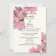 Din information om bröllop finns i det aktuella, moderna typsnitt som är centrerad på en rektangel med elfenbensbakgrund med ett underbart foto av rosa azaleas som dekorerar alternativa översta hörn och grund. Ordalydelsen är den moderna traditionella "tillsammans med deras familjer", med den brud och grupp som utökar inbjudan. Elfenomenet med vackra rosa blommor skapar en klassisk känsla för en modern, uppdaterad bröllopsinbjudan. Kortet är också elfenbenst färgad.