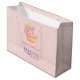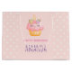 En födelsedagspresentpåse med en akvarellteckning av en cupcake med rosa glasyr, en enhörningshorn och färgglada rosor.