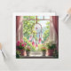 Ett fantastiskt blankokort med en illustration av en vacker drömmare med rosa fjädrad som hänger i fönstret med en hylla av rosa och vita kratblommor under den, och som bortser från en fullt av Lucius grönt träd.