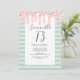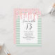 Födelsedagsinbjudan med söt rosa drip med strössel, ljusa och mörka gröna ränder som representerar en läcker tårta.