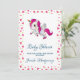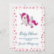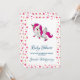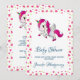 Baby shower-inbjudan med en vit bevingad enhörning med rosa man, svans och hovar. Hornet har ringar i regnbågens färger och ser ut som en godis-sockerlollipop. Denna söta enhörning reser sig på sina bakben. Sött rosa hjärta på kinden. Bakgrunden är ett mönster av rosa och gröna hjärtan. Fullständiga festerdetaljer finns på baksidan.
