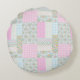 En chic Round Pillow eller Cushion, med ett söt, nostalgiskt faux-lappverk mönster av rosa Dogroses på en himlar blå bakgrund med matchande polka dots, rand och plätering. En del av "Rosy Posy Posy"-samlingen Posh & Painterly kan lätt justeras till mönster så att det passar alla Pillow eller Cushion.