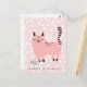 NewParkLane - Nu kommer trubbel! Sött barnkalas vykort med en söt rosa tecknad figur, mot en rosa bakgrund med vita prickar.