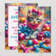 Rosa och blå flickas födelsedagsinbjudningar. Redo för en superbra födelsedagsfest! Söt katt och födelsedagspuns. Söt födelsedagskattunge som leker med slingor och band. Färgglad rosa och blå ai-konst.