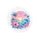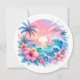 Söt tropiska oasis Greeting Card. Rosa och blåa kustkonst med handflatan träd, tropiska blommor i solnedgång och havsvatten vinkarare. Söt tropisk konst till ge i ditt hem känner en biffkänsla!