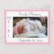 Ett enkelt, överkomligt och förtjänstfullt sätt att tillkännage att ditt vackra flicka kommer. Vit vykort gränsar till rosa med en viskbuk, med finare text som säger: "Det är en flicka," med baby namn och födelsedatum på framsidan. På baksidan finns en liten söt rosa ros med ett område där ni kan lägga alla födelsedetaljer, t.ex. när och var baby föddes och hur mycket hon vägde.