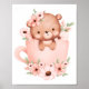 Söt rosa teddybjörn i en kopp med blommor, väggdekor för flickors barnkammare.