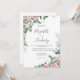 Den här eleganten är en modern bröllopsinbjudan med rosa vattenfärgsbuketter som accentueras med eukalyptus greenery i två hörn på vit blommigt. I anpassadet kombineras träkol-grått-liknande handstil, kopparplåt och kursivt typsnitt. Den omvända sidan är helt vit.
