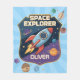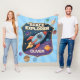 Denna lekfulla personliga fleecefilt har ett djärvt rymdutforskar-märke. I mitten av märket syns en lekfull seriefigur-raket som flyger genom rymden med planeter som kretsar runt den.