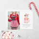 Illustration av röd och rosa pepparkaksburk-milkshake toppad med vispad grädde, pepparkaksgodis, godisstrut och julgransformad julkaka. Texten säger, "jag önskar er en söt högtid" Anpassa namn, år och foto.