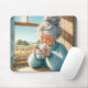 Solstrålande strömmar genom ett fönster och belyser en kvinna med grått-hår i en mysigt blå svettare när hon har en varm dryck i en mugg märkt "Bra Morgon".