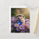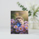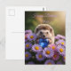 En söt igelkott som håller en hjärtformad safir sitter i en rabatt med rosa och lila asters.