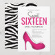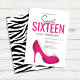 Denna design har en födelseinvitation, en födelsedagsfest, söt 16, sexton, ljust rosa, chic tjej, rolig, fantasifull söt, kvinnors flickors skor, djurtryck, enkel stilren, script typografi