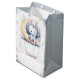Toppen söt presentväska med söt, vit, liten bunny med en vacker blå bog sitta på ett underbart måne med några guld fallande stjärnor och några dammiga blå moln.