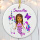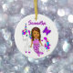 Cute tecknad whimsical hand plockade folkart stil African-American, Hispanic eller Bi-rass Sjöjungfru Princess och Unicorn med lila och rosa butterfly personlig julprydnad.