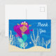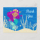 Självskrivna sjöjungfru tack-kort med en söt latinamerikansk flicka med lila hår och en cool teal stjärt som simmar bredvid vacker korall i havet. Coolt sommarfödelsedags tack-kort för barn.