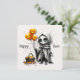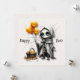 En magisk halloweenillustration av en monokrom skelettflicka i en trasig kappa med ljusblå ögon som håller orange pumpaformade ballonger mot en spindelnätsbakgrund, med en korg full av färgglada godisar som står bredvid henne. Perfekt för att skapa en läskigt söt halloweenatmosfär.