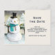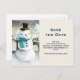 Jul fest spara datum med en söt teckning som visar en snöman som bär en cool topp hatt och halsduk. Bakgrunden har en rad fantasifulla snötäckta tallar.