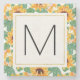 En sten underlägg med en söt sommar mönster. Solblommor av söt gult omgivna av grönt löv i ett upprepande mönster. En kvadrat ram med faux guld gräns med din monogramstart inuti.