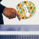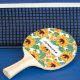 Ping pong paddle med en söt sommar mönster. Solblommor av söt gult omgivna av grönt löv i ett upprepande mönster. En vit rektangel ram överst med texten inuti.