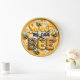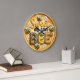 Denna fantastiska runda väggklocka har en livfull, digital 3D-illustration som firar honungsbinas charm. Designen visar den lekfulla ordleken "Sweet as can BEE" i stora, texturerade bokstäver. Bokstaven B har ett trendigt leopardmönster, medan E är fyllt med en realistisk, gyllene bikupetextur. Förtjusande, knubbiga seriebin med rosiga kinder och blå vingar flyger runt urbladet, åtföljda av knappa vita prästkragar och en träsked för honung som droppar av gyllene nektar. Bakgrunden är ett detaljerat, gult bikupelaster som ger djup och karaktär. Inkapslad i en ljusgul ram är denna funktionella heminredning ett perfekt tillägg till kök, barnkammare eller solrum