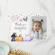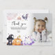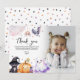 Överraska dina vänner och familj med ett tack de inte kommer att glömma! Ditt barns spöktalande Halloween-födelsedagsfest är det perfekta sättet att visa din tacksamhet för deras speciella dag och presenter. Med en bild, plus vackra akvarellbilder av pumpor, spindlar, fladdermöss, häxor, katter och stjärnor, är detta tackkort säkert en hit.
