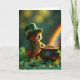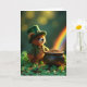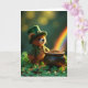 En söt, luddig nallebjörn som bär en gnistrande grön leprechaunhatt och kappa beundrar en regnbåge som kommer från en gryta med guld. Det finns treblad runt honom på marken.