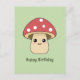 Ett grönt födelsedagskort med en illustration av en söt svamp i tecknad stil och anpassningsbar text nedan! Det kan vara perfekt att skicka till ett barn, en mykolog eller en vän som älskar Kawaii-karaktärer och natur!