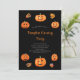 bjud in vänner till din årliga pumpa skär fest med detta vackra kort med akvarellmålade pumpor med roliga ansikten alla på en modern svart bakgrund med höstlöv , ger halloween-inbjudan en riktig höstkänsla.
