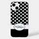 Personlig retro trendig flickig iPhone-fodral med din initial och namn. Bedårande Cool retro mönster med vita prickar och svart bakgrund.