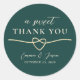 Lägg till en personlig, hjärtlig touch till dina bröllagspresenter med denna eleganta smaragdgröna runda etikett med ett guld-rep hjärta och modernt skrivsätt som läser ett sött tack. En vacker matchning för din smaragdgröna bröllagssvit, perfekt för att försegla påsarna, lådorna eller burkarna med godsaker.