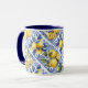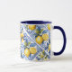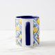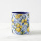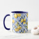 Blått, söt medelhavsplattan skriver ut kaffe mugg-ljust koboltblått, gult, ljusblått med citroner i stil på plattan och konstform från Positano-Italien. Praktisk gåva till någon som kärlek i det italienska stil-potteriet. (Det finns en matchande kökshandduk och apron.) Se ett annat Medelhavsbrickkaffe i mugg: https://www.zazzle.com/pretty_talavera_tile_all_over_print_lemons_mug-256288731119659494