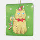 Vintageillustration Julfirande design med en söt orange katt som bär en tomteluva och röd rosett. Denna bedårande lurviga katt har ett stort brett Cheshire Cat-leende och en godisstake som hänger från hennes svans. Stjärnor gnistrar på den gröna bakgrunden.