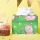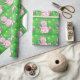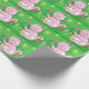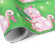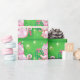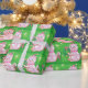 Vintageillustration Julfirande design med en söt rosa katt som bär en tomtehatt och en rosa halsband med klockor. Denna bedårande lurviga katt håller en julkrans och har ett rött band som hänger från hennes svans. Stjärnor gnistrar på den gröna bakgrunden.