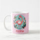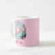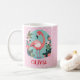 Personlig söt tecknad blomsterrosa flamingo och prickar muggdesign. Denna söta tecknade flamingo fungerar som fokuspunkten, med sitt älskvärda uttryck och lekfulla pose, och fångar omedelbart hjärtan med sin charm. Runt flamingon finns noggrant utformade blommor. Den övergripande effekten är en harmonisk komposition som utstrålar positivitet och glädje.