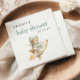 Dessa söta baby shower servetter har en akvarell teddybjörn utklädd som astronaut, ridande på en rymdfarkost under orden "baby shower" i blågrön handtryckt stil. Anpassa texten med den blivande mammans namn och datum i kolgrå sans serif.
