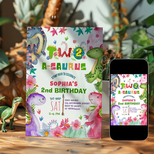 Söt tjej dinosaurie 2-års födelsedagsinbjudan