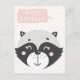 NyParkLane - Vykort, med en söt svart, vit och grå tvättbjörn i akvarell, med en rosa pratbubbla med ett "Grattis på födelsedagen"-önskning, mot en rolig abstrakt mönstrad rosafärgad och vit bakgrund.