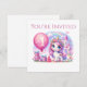 En söt Unicorn firar sin första födelsedag med gåvor, en rosa ballong och ett rosa slott. Perfekt för en flicka första födelsedagsfesten. Lägg till egen anpassad text.