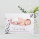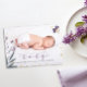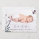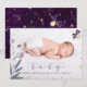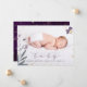 Dela glädjen av din nyfödda med detta förtrollande födelsekort! Med ett älskligt barnfoto, ömtåliga fjärilar och skimrande guldaccent på en djup lila bakgrund är det ett vackert sätt att presentera din lilla en.