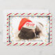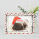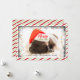 Juldkort med en bedårande bild på en mopsvalp som sover med en tomtehatt på sig. God Jul står skrivet på hattens band i ett trendigt handskrivet teckensnitt. En grunge-kant med färgglada julbelysningar omger ramen på detta söta foto. Bakgrunden har ett festligt röd-vit-grönt randigt mönster i godisstil. Personlig anpassning med ditt namn. Signaturraden lyder: Kärlek och mopsar, med ditt namn. Meddelande på baksidan som kan anpassas personligen.